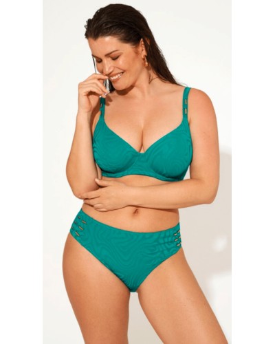 Bikini en copa C, con aro y sin foam, tejido en relieve y pequeño detalle de joya en la braguita y tirante del sujetador.