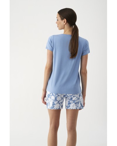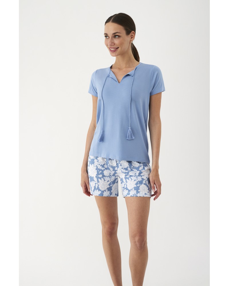 Pijama de caballero con estampado de hojas en color marino, con abertura abotonada en el pecho, de manga corta la blusa y pantalón corto.