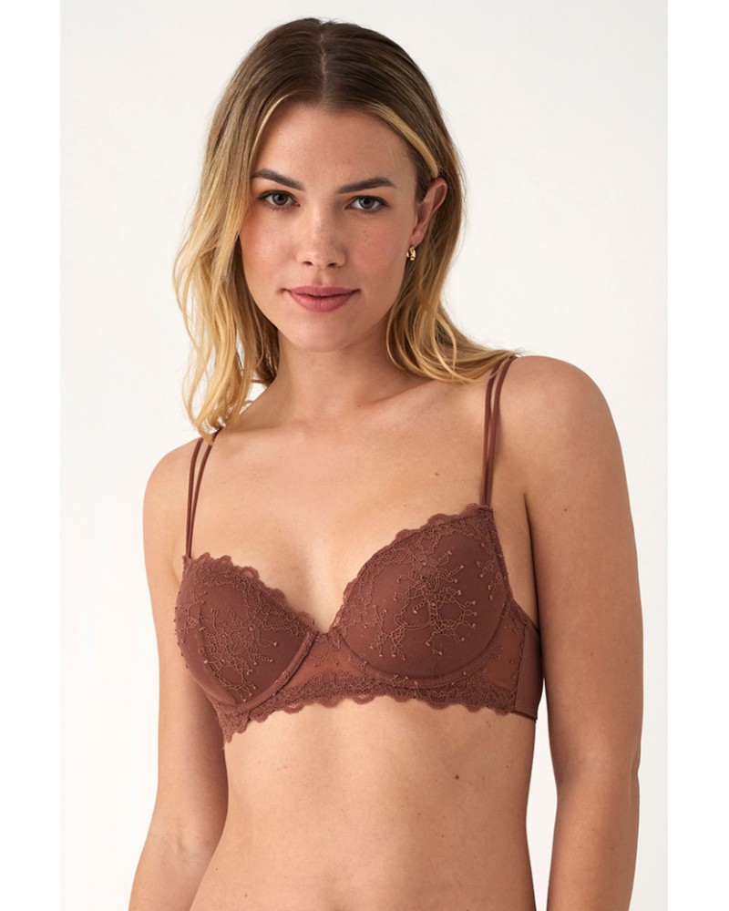 Sujetador de encaje en color chocolate, detalle de doble tirante, con aros y foam.