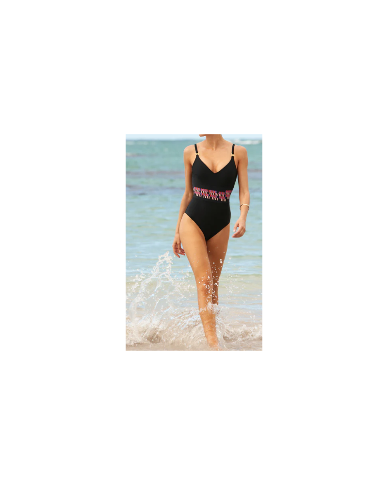 Bañador negro con cenefa en el bajo pecho para acentuar la forma de él, detalla de cuentas en los tirantes y con forro interior moldeador.