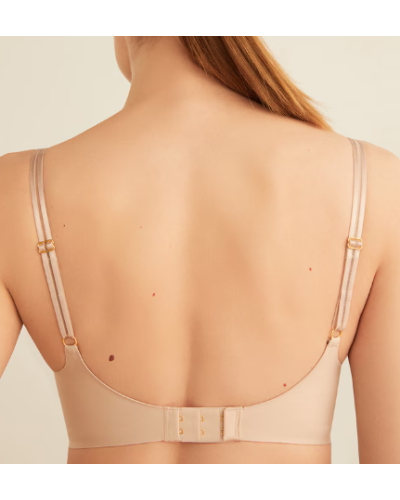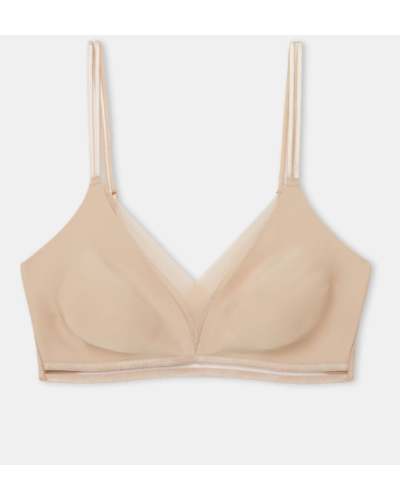 Sujetador sin aro y sin foam con detalle de tul en el escote y tirantes con pequeña transparencia.