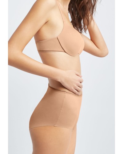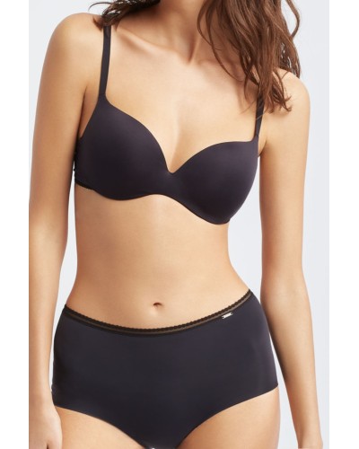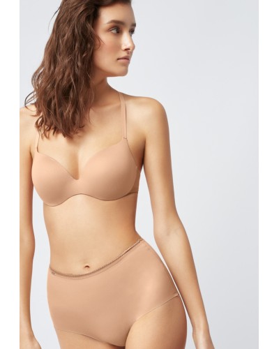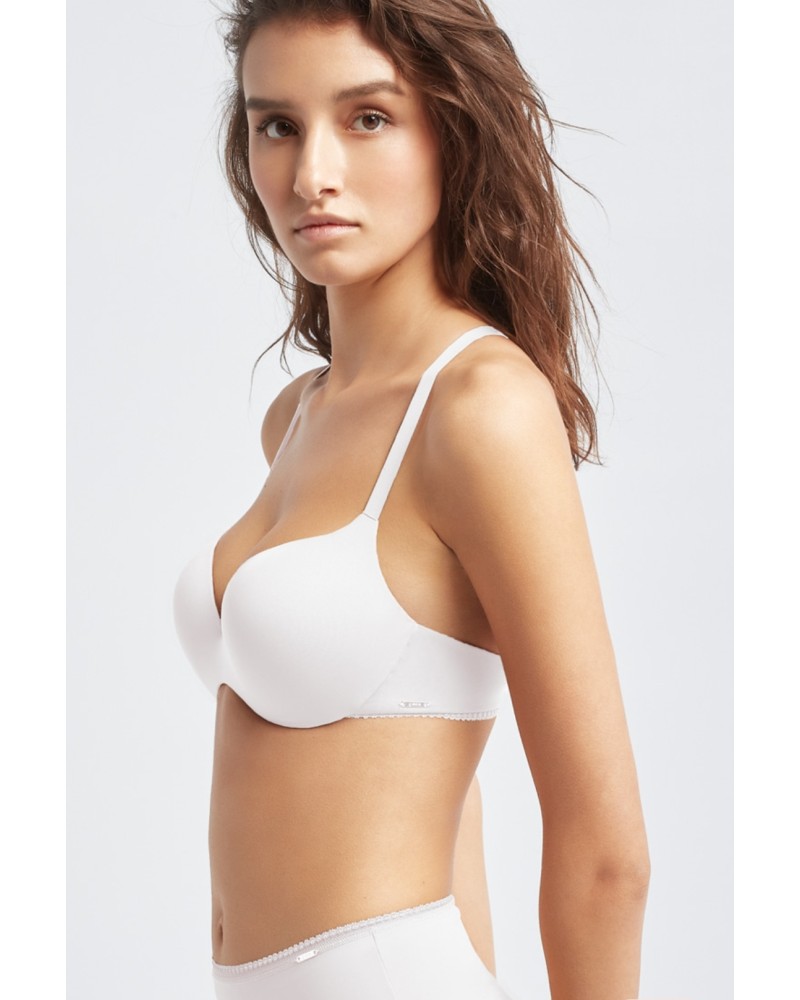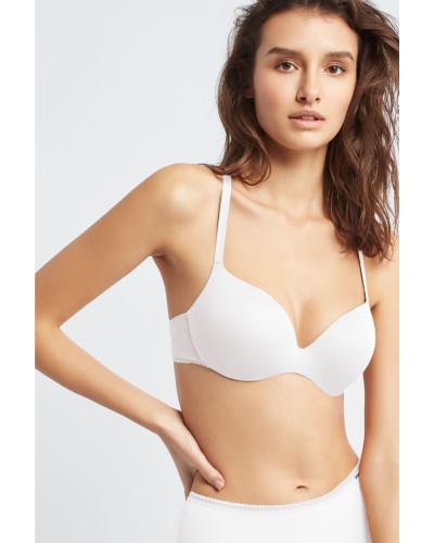 Sujetador clásico con aro y foam. Copas “Soft Lining” interiores continuas sin cortes que no marca en la ropa y con acabados extra suaves. Doble tejido en espaldilla para una mayor sujeción y tirantes regulables multiposición. Cierre trasero de cuatro posiciones y detalle de galón de encaje en espaldilla.