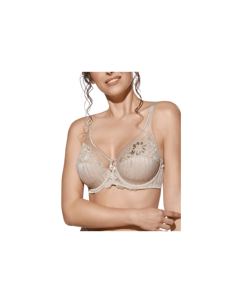 Sujetador con aro que combina un elegante tejido con franjas y copa den tul con encaje.