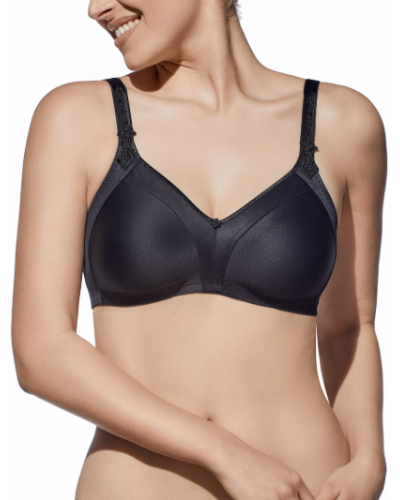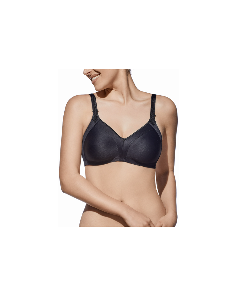 Sujetador clásico de microfibra preformada, sin aros, refuerzo lateral y con adorno de guipur en el tirante.