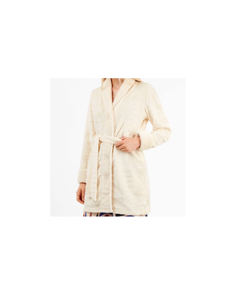 Bata en tejido peluche en la que aparecen grabadas formas geométricas en relieve con botones delanteros, cuello y puños a contraste y anudada en cintura.