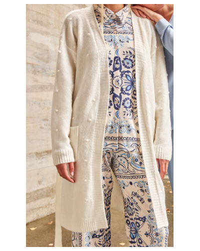 Bata en tejido tricot con topos en relieve, de estilo batín, con cinturón lazada en la cintura para un ajuste cómodo. Cuenta con bolsillos delanteros funcionales y está confeccionada en color crudo, ideal para mantenerte abrigada y con estilo en casa.