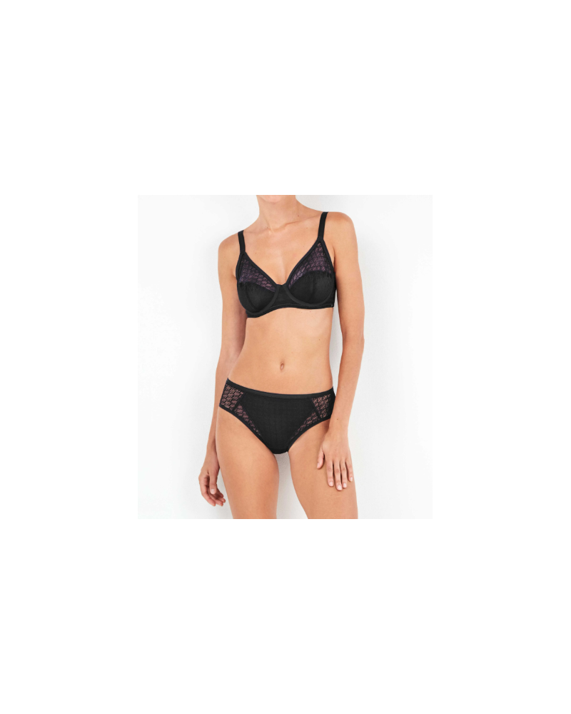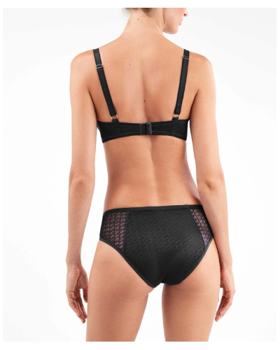 Sujetador capacidad sin relleno y con aro de tul en jacquard con la “g” de gisela aplicado a modo de all-over. Interior copa y base reforzado para una máxima sujeción. Braguita midi con tul con el mismo estampado que el sujetador y refuerzos en el frontal y el trasero.