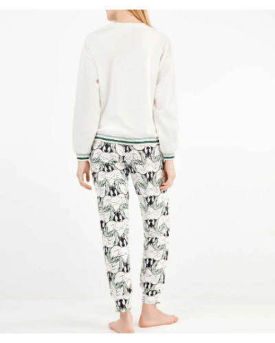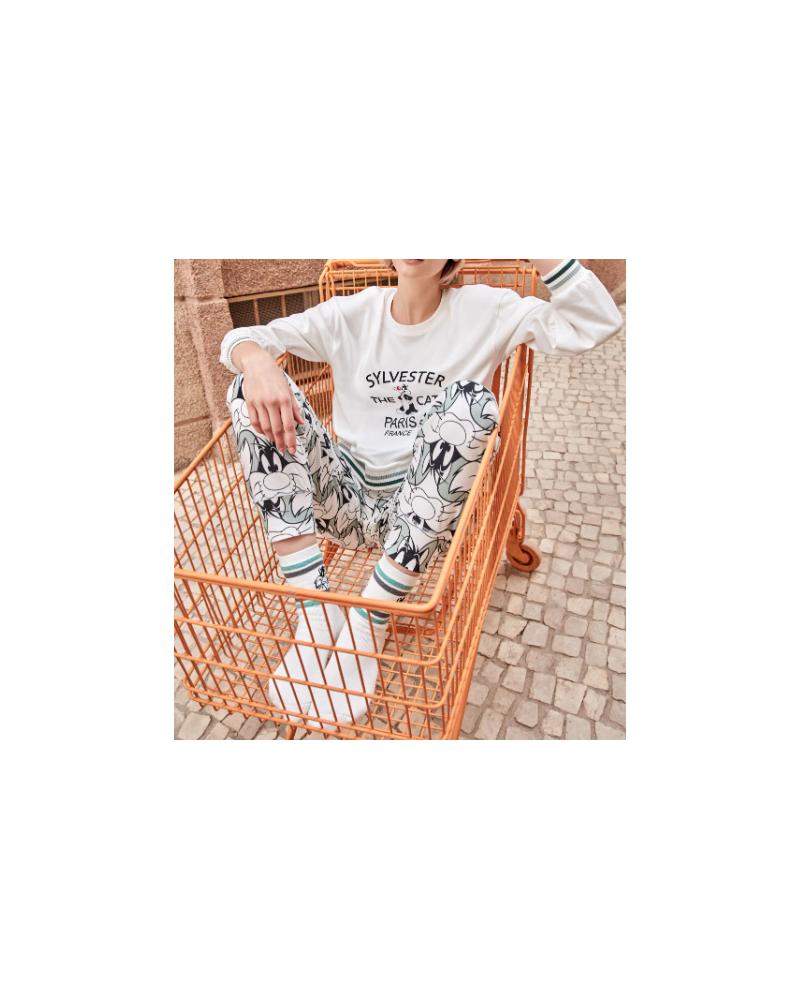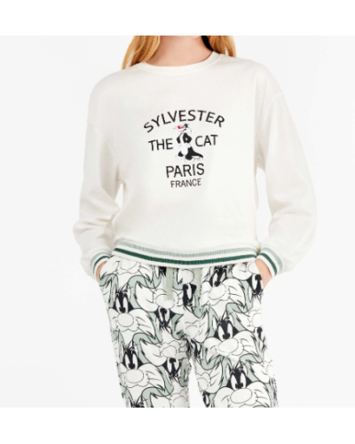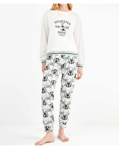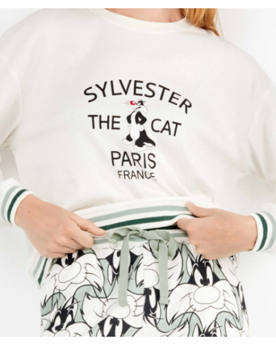 Pijama en tejido punto interlock con camiseta de corte oversize dibujo posicionado de Sylvester en el centro y detalle rib en cuello, mangas y cintura. El pantalón estampado bicolor el gato Sylvester acabado en puños y cinturilla con rib rayas a contraste y ajustable con cintas.