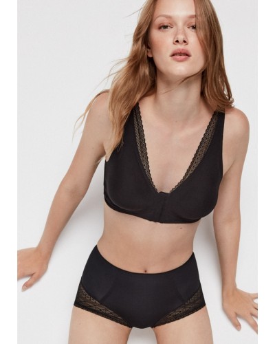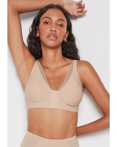 Sujetador post-operatorio con funda para prótesis, sin aro y con foam extraíble. Detalle de encaje en escote y cierre delantero y trasero para mayor comodidad. Acabados termofusionados para mayor confort. Tejido de microfibra extra suave y tirantes anchos para mayor sujeción.