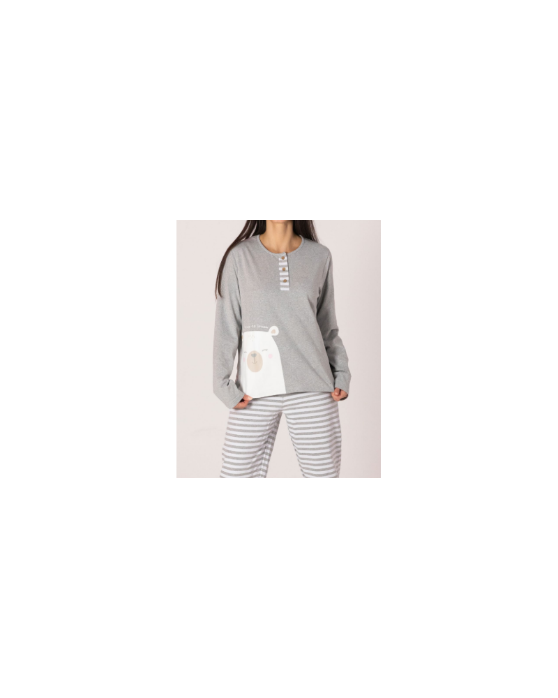 Pijama de mujer con dibujo en la camiseta y pantalón de rayas con puños en los tobillos.