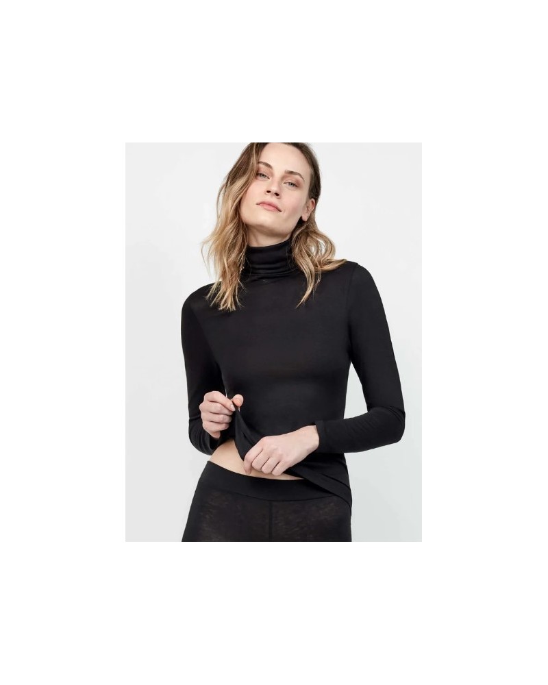 Camiseta ligera de cuello alto y manga larga. Tejido fino, suave y cálido con mezcla de lana y viscosa. Corte recto y carácter versátil para usarse tanto en interior como en exterior.