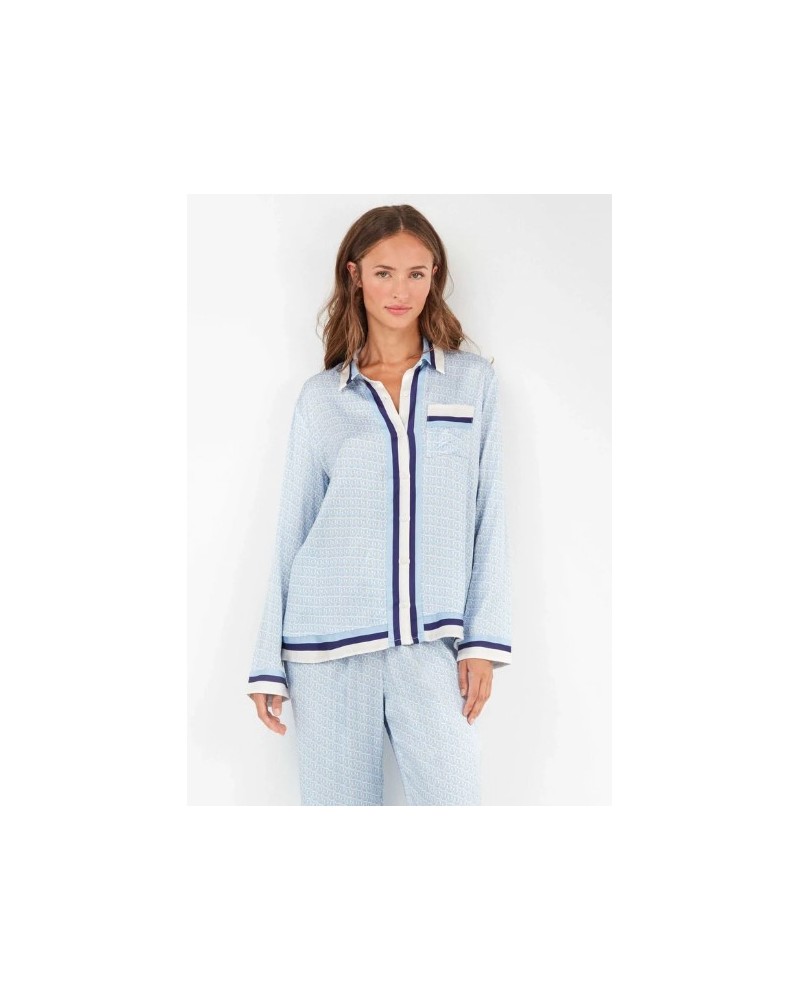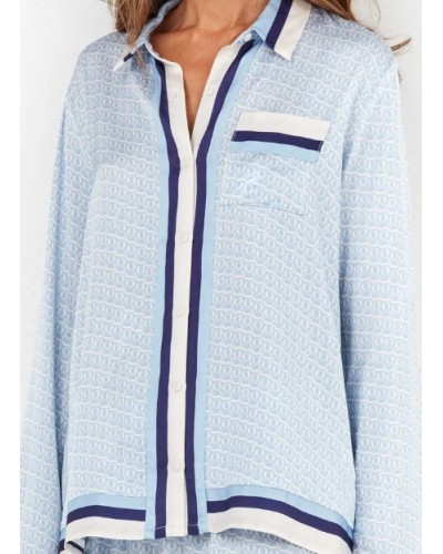 Pijama camisero con estampado monogram logo en tonos celeste y beiges y pinceladas de marino. Confeccionado en satén compuesto por una camisa cuello mao botones delanteros y bolsillo con cenefas a contraste en los extremos. Pantalón recto ajustable en cintura y cenefa en el bajo a contraste.