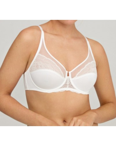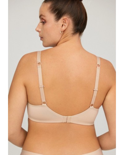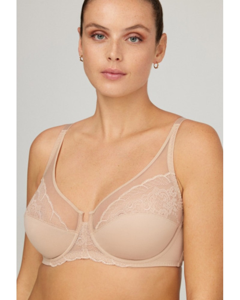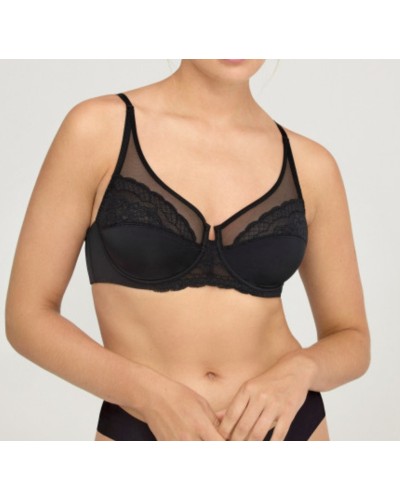 Sujetador sin relleno y con aros realizado en microfibra combinada con delicado encaje sobre tul. Modelo ideado para ofrecer todo el confort y sujeción que requieren las tallas de más capacidad sin renunciar al encaje. Pieza del centro del escote alta para una mejor sujeción. Tirantes regulables y espalda ajustable. Incorpora pieza cruza tirantes.