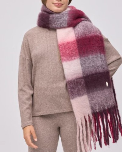 Estilo british renovado. Bufanda tipo pashmina de cuadros grandes en tonos granate, rosa y blanco. Elegante, cálida y con presencia.