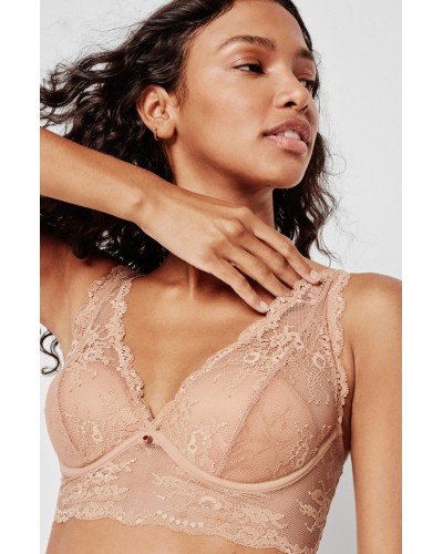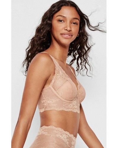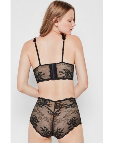 Sujetador capacidad en tejido de encaje con aro y foam. Tirantes regulables que incluyen enganche para poder cruzarlos. Espaldilla anatómica de microfibra brillante extra suave y cierre de cuatro posiciones. Costuras invisibles y detalle de pendant en el centro del pecho