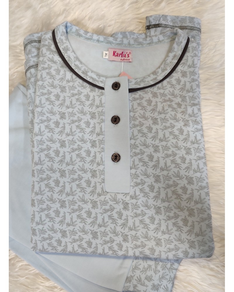 Pijama de mujer en interlock afelpado en el interior . Con tapeta y botones en el escote, y puños en el pantalón