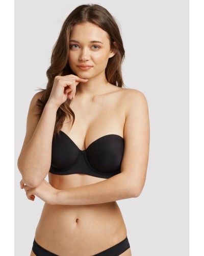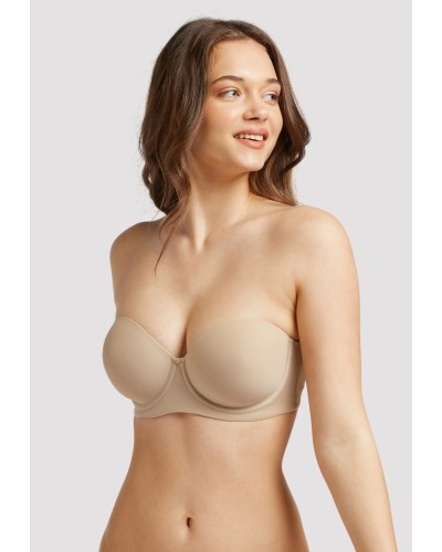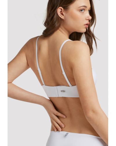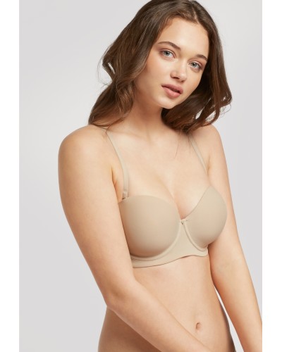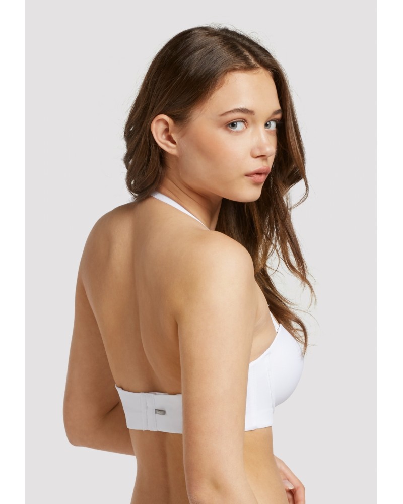 Sujetador desmontable con aro y foam. Gomas siliconadas para máxima adherencia y soporte y acabados invisibles extraplanos. Tirantes regulables y multiposición. Cierre trasero de 4 posiciones y botón decorativo en el escote.