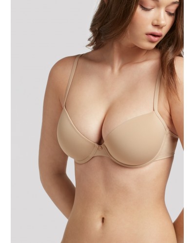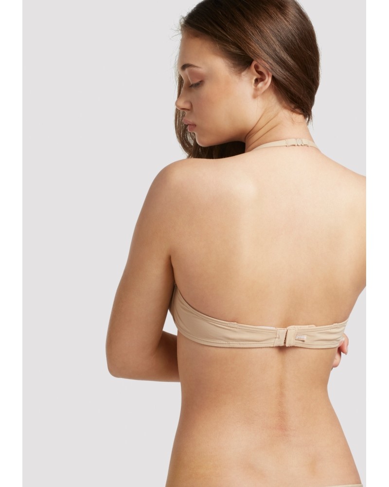 Sujetador básico con aro y foam. Tirantes regulables que incluyen enganche para poder cruzarlos. Cierre trasero de cuatro posiciones y detalle de botón decorativo en el centro del escote.